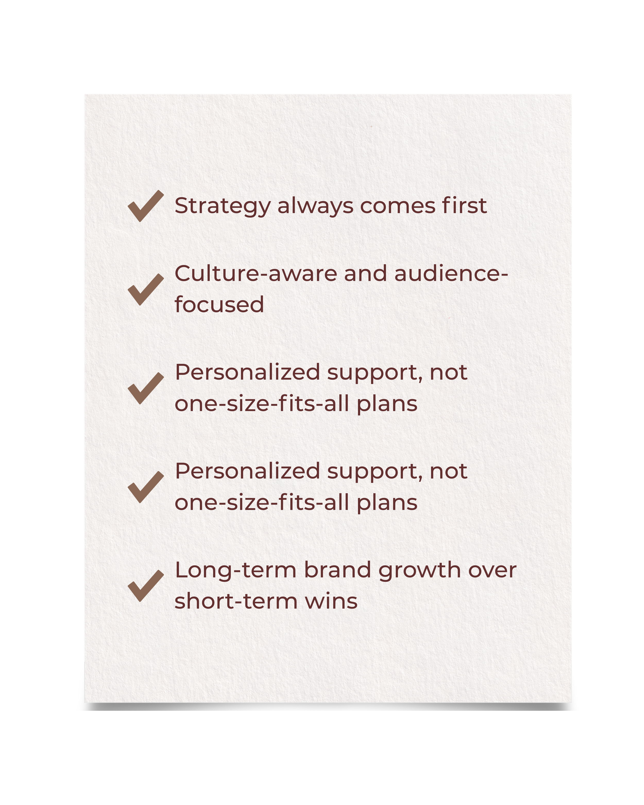 We don’t believe in cookie-cutter strategies or chasing trends just because they’re popular. Everything we do is intentional, customized, and rooted in what makes your brand unique.